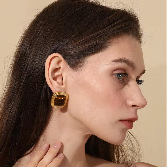 Boucles d’Oreilles Carrées Œil de Tigre – Acier Inoxydable Plaqué Or