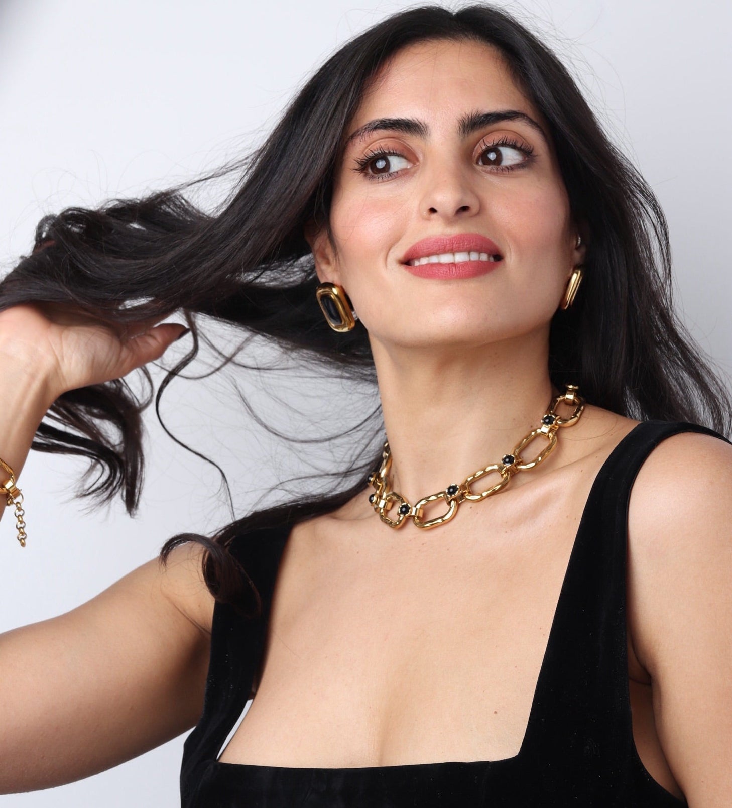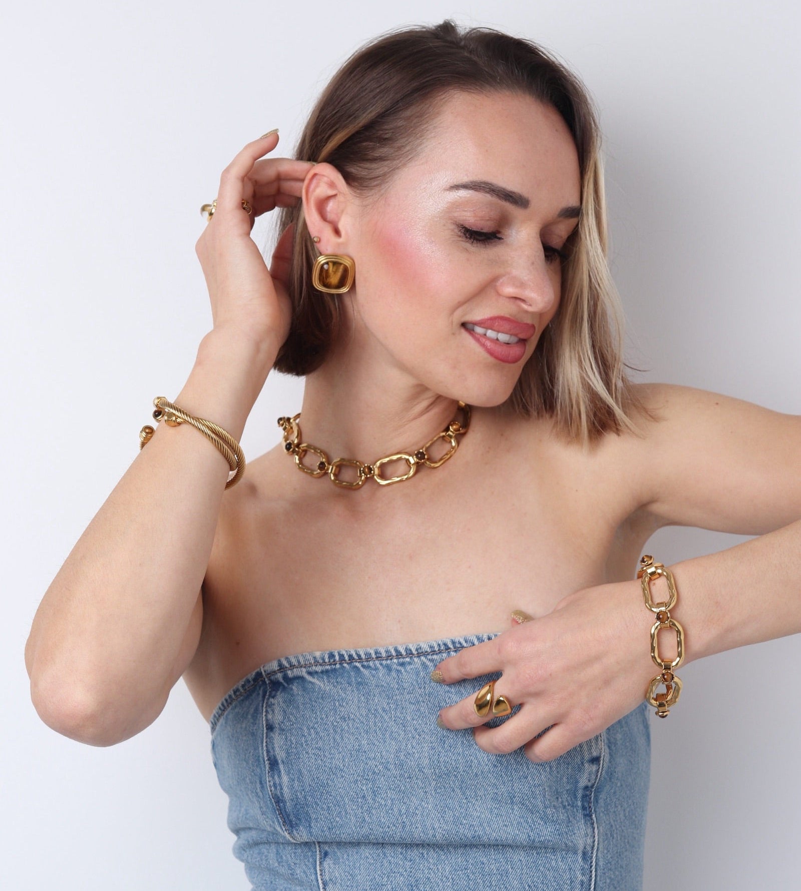le collier Maiwenn est une pièce-statement au look couture : de larges maillons ovales martelés en doré, rythmés par des cabochons de pierres naturelles. Ajustable grâce à la chaînette, il se porte ras-du-cou ou un peu plus long.