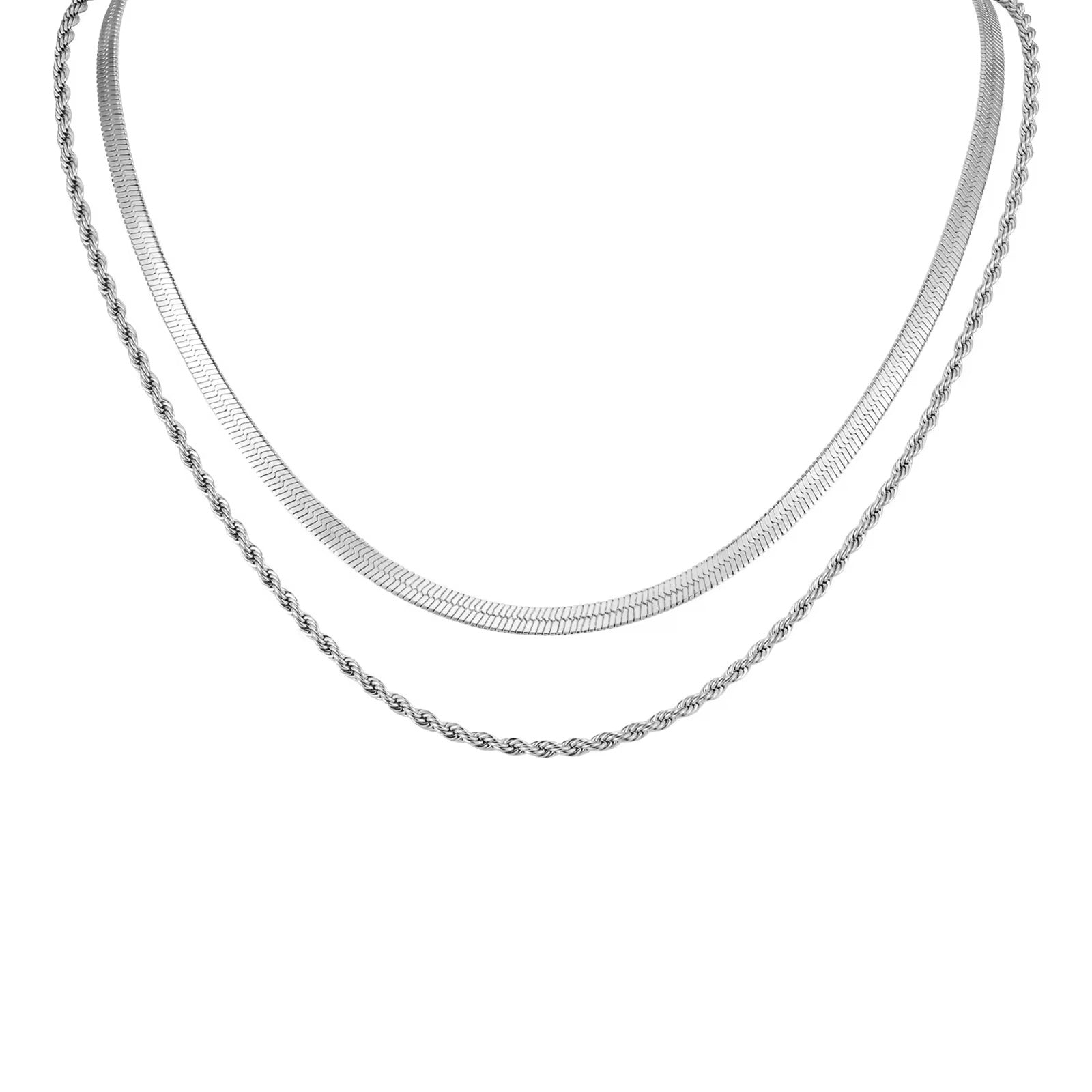 Together est un collier unique sa double chaîne, il combine deux styles en un seul, une chaîne en style corde intemporelle et l'autre en chaîne serpent torsadée tendance, créant ainsi une apparence distinctive et unique.